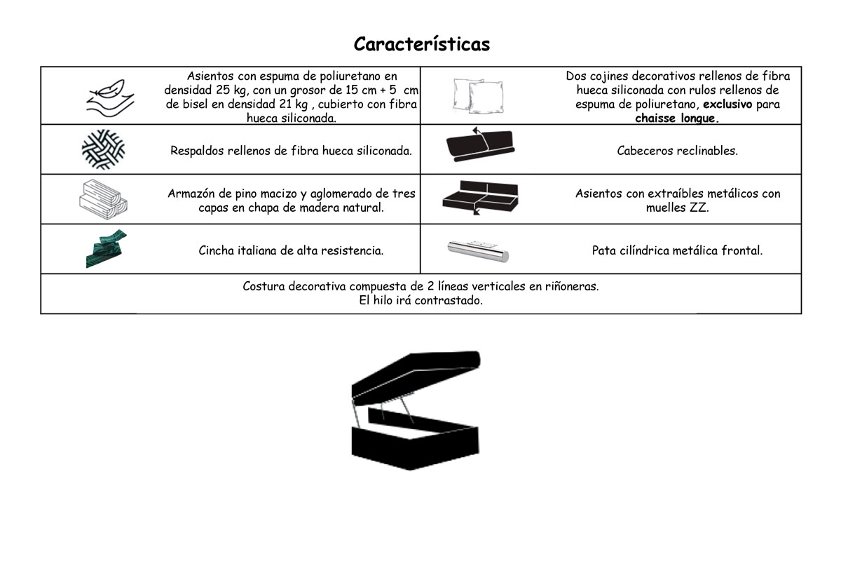 Asientos con espuma de poliuretano en densidad 25 kg, con un grosor de 15 cm + 5 cm de bisel en densidad 21 kg , cubierto con fibra hueca siliconada. Respaldos rellenos de fibra hueca siliconada. Armazón de pino macizo y aglomerado de tres capas en chapa de madera natural. Cincha italiana de alta resistencia. Dos cojines decorativos rellenos de fibra hueca siliconada con rulos rellenos de espuma de poliuretano, exclusivo para chaisse longue. Cabeceros reclinables. Asientos con extraíbles metálicos con muelles ZZ. Pata cilíndrica metálica frontal. Costura decorativa compuesta de 2 líneas verticales en riñoneras. El hilo irá contrastado.